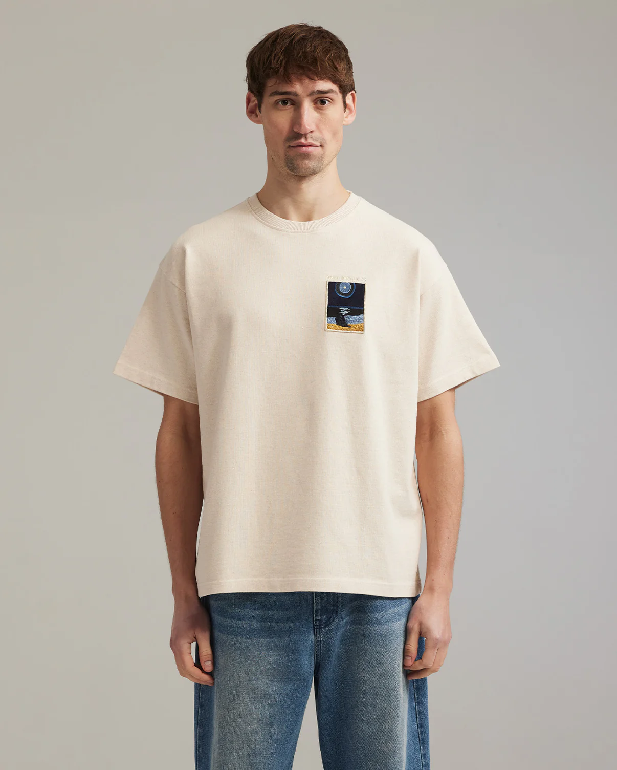 Zwaar katoenen T-shirt met een geribbelde kraag. Deze stijl heeft een geborduurd patch op de borst.