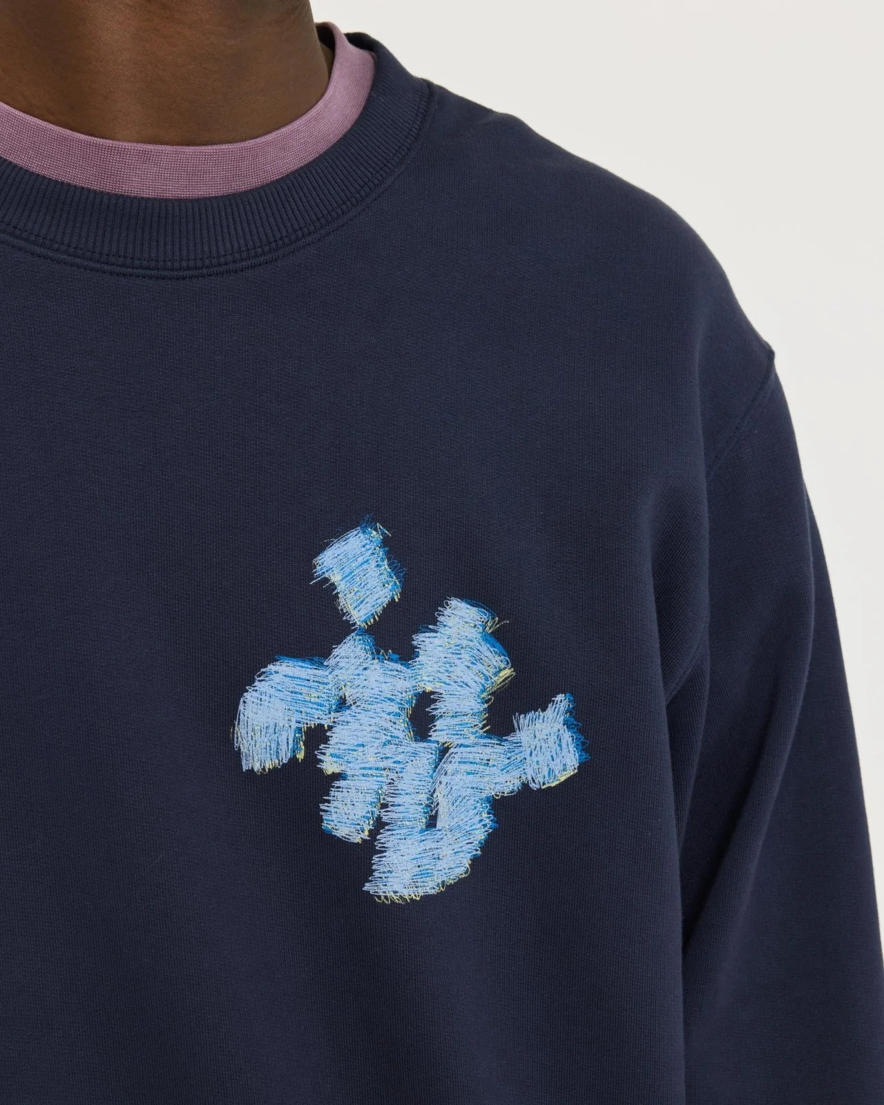De Aura-trui is vervaardigd van 100% katoen, Portugees materiaal in ongeborsteld loopback-fleece. Gefragmenteerde letters, gelaagd met getextureerde penseelstreken in tinten blauw en wit, creëren een speelse maar abstracte compositie aan zowel de voor- als achterzijde. De zachte, reguliere pasvorm maakt het een opvallend kledingstuk voor dagelijks gebruik met een subtiele grafische uitstraling.