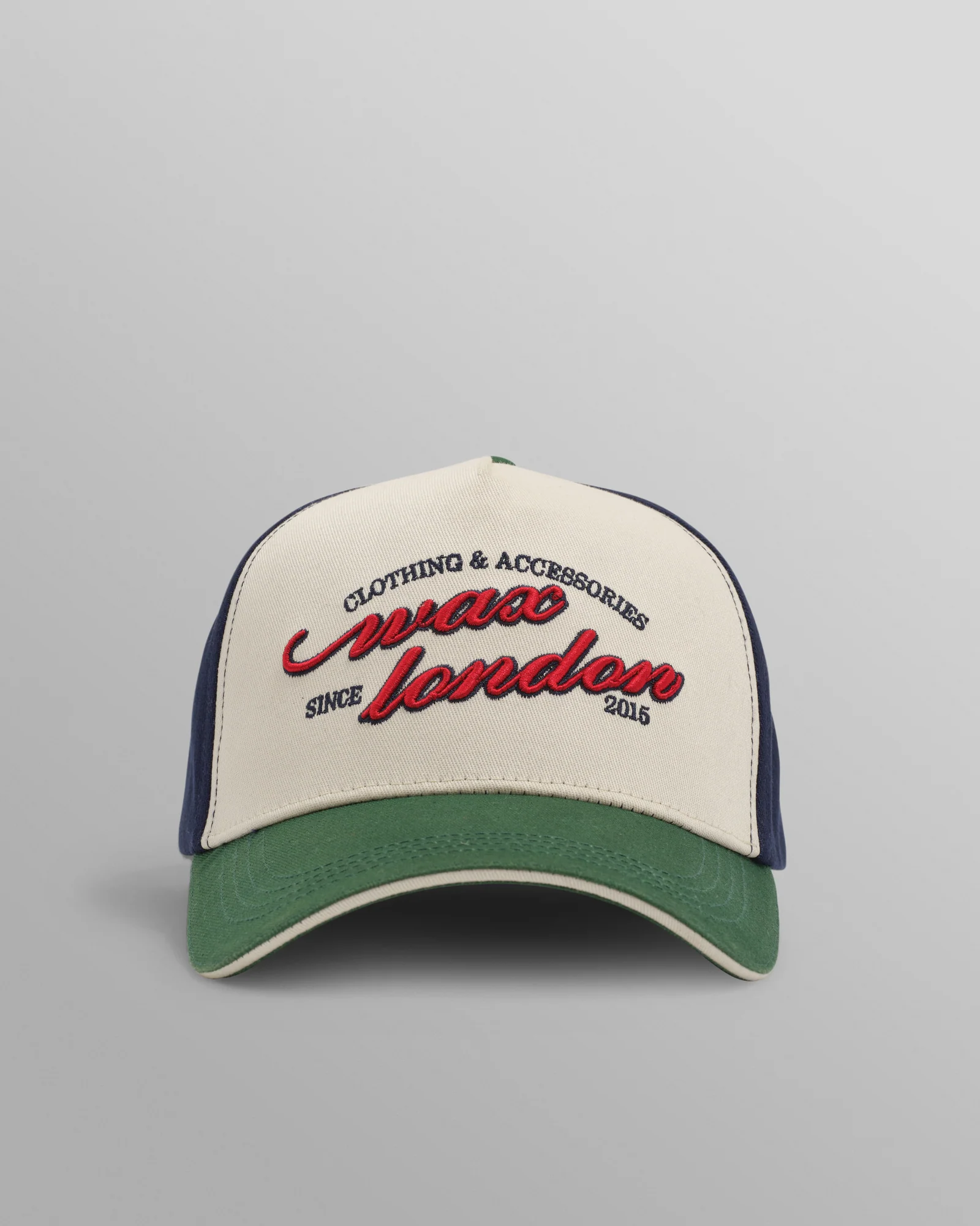 Versier je hoofd met de Dale – onze versie van de klassieke truckerpet. Ontworpen met een gebogen klep en een constructie met 5 panelen, is hij gemaakt van 100% katoen in deze ecru, marineblauwe en groene kleurstelling en voorzien van een speciaal Wax London scriptlogo in opvallend rood.