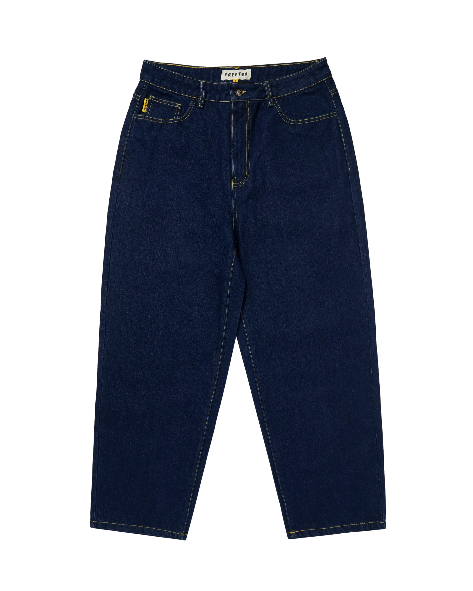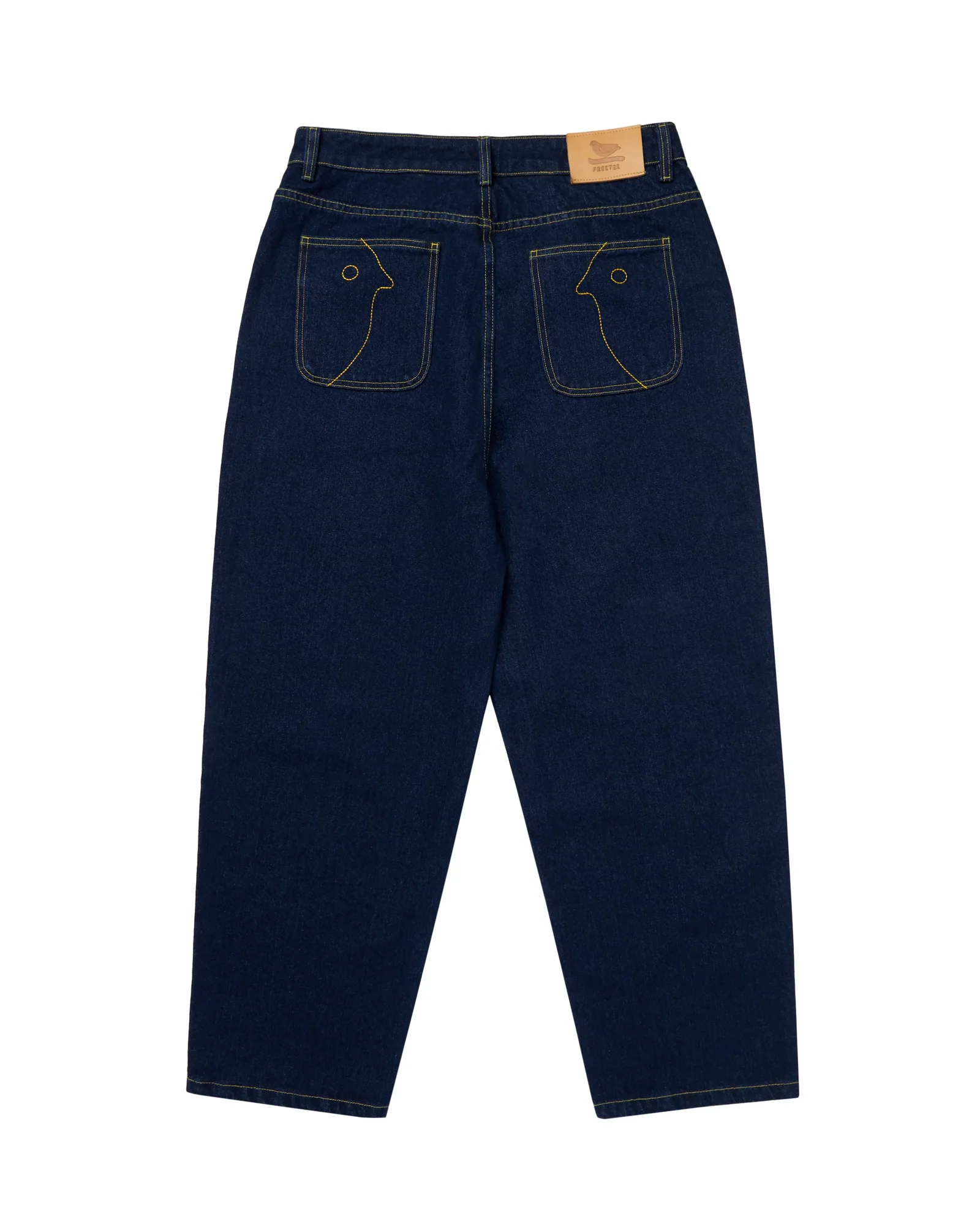 Blauwe spijkerbroek met gele stiksels, voorzien van Freeter-vogel enkele steken borduurwerk.