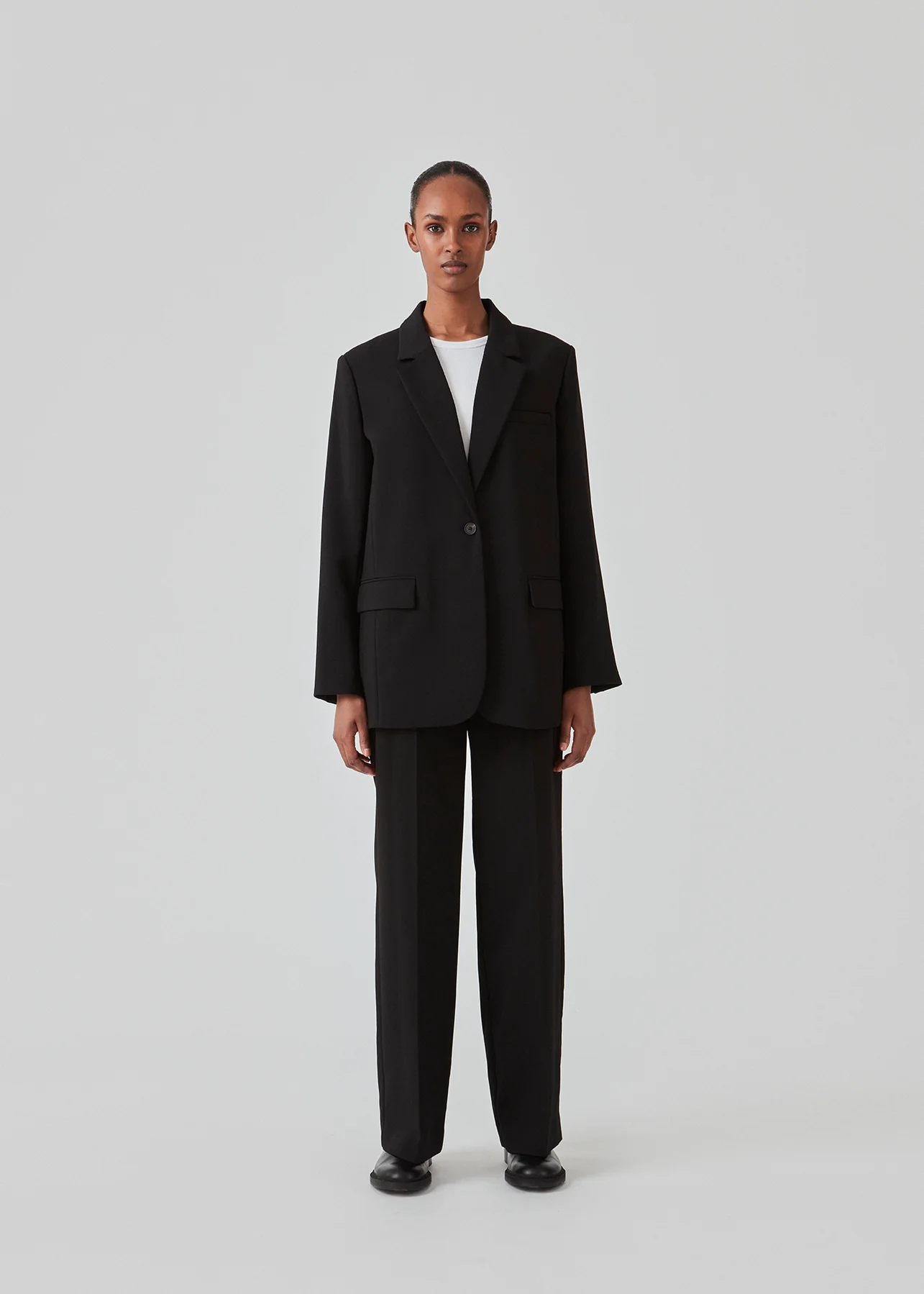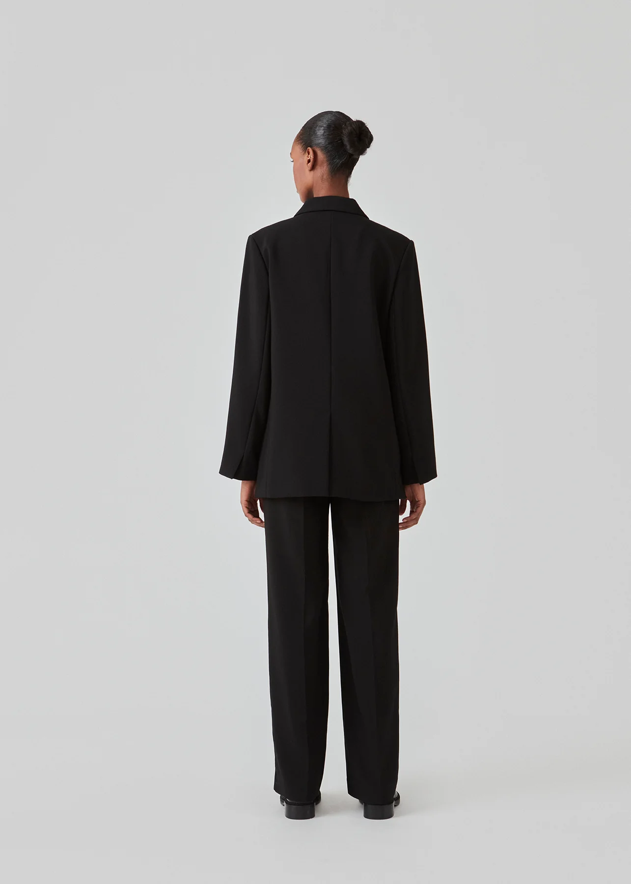 De Gale-broek in het zwart heeft een klassiek ontwerp. De broek heeft rechte, wijde pijpen met persvouwen, wat een elegante uitstraling geeft.Koop de Gale-blazer in dezelfde kleur die bij de broek past.