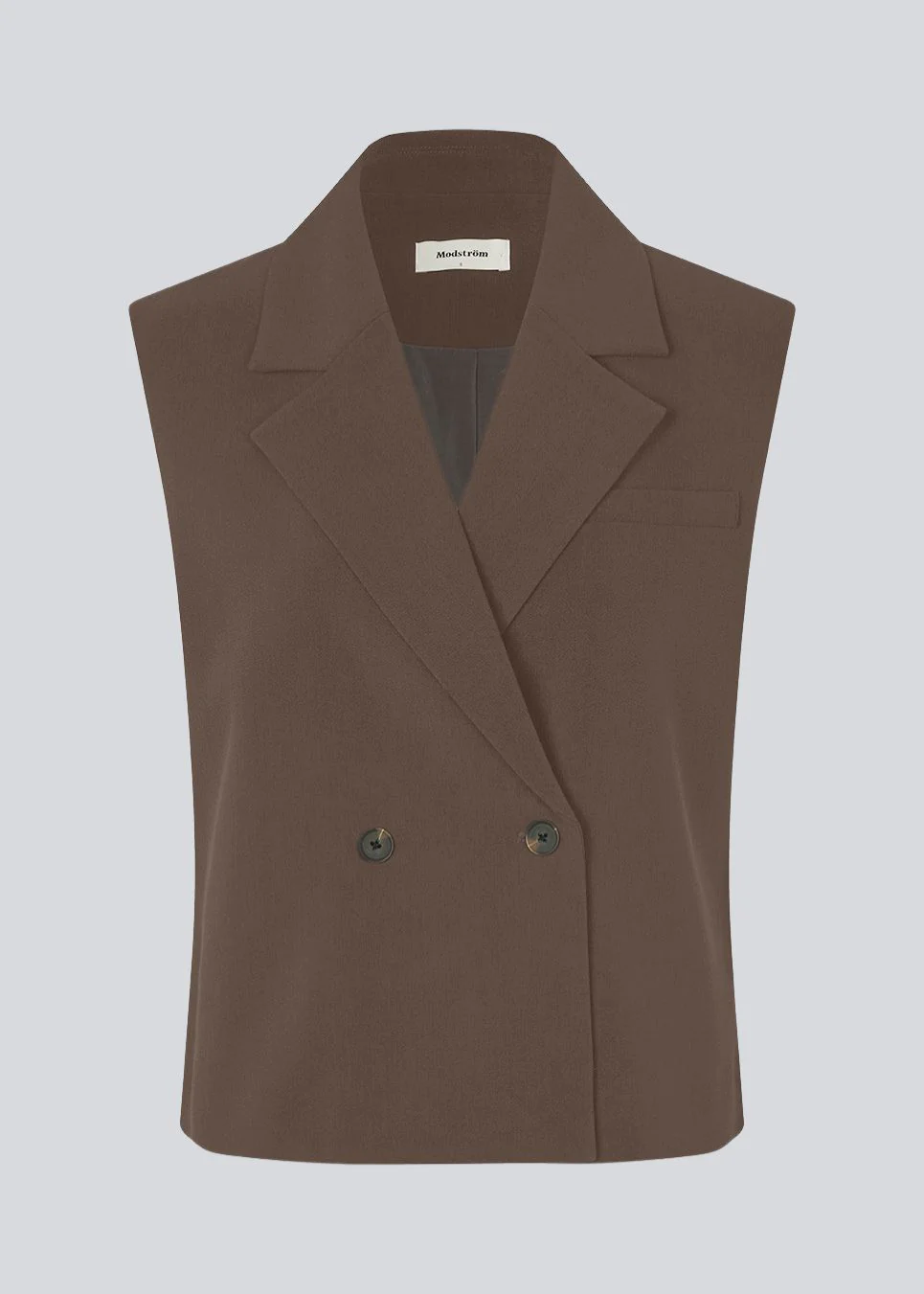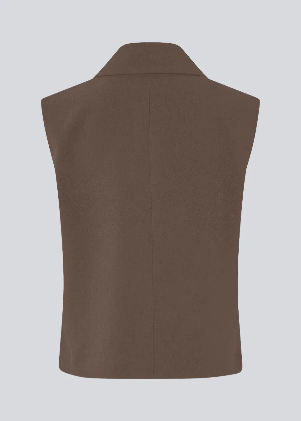Los gilet in bruin met een kraag in ons klassieke Gale-materiaal. Het Galemd-gilet is mouwloos en heeft een sluiting met knopen aan de voorkant.