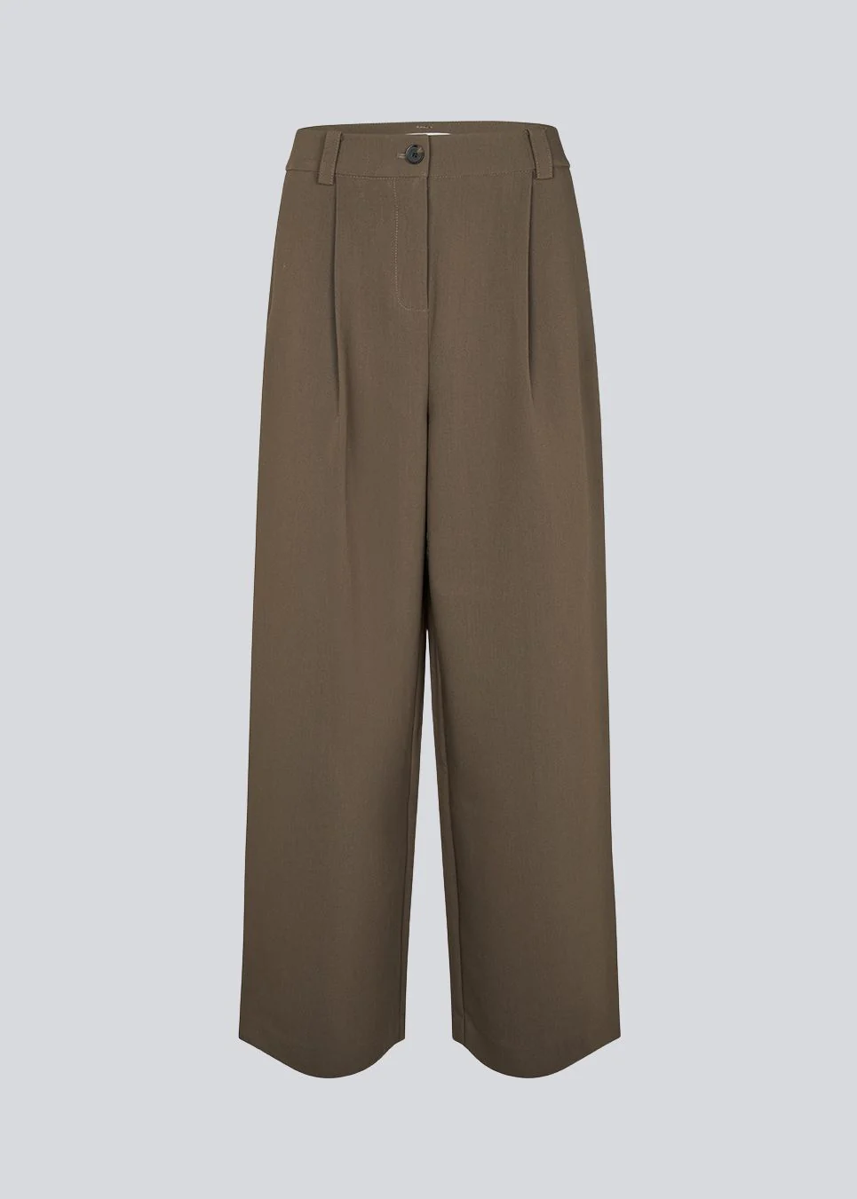 Donkerbruine broek in een ontspannen pasvorm met een normale taille en plooien aan de voorkant en brede, lange pijpen. De colbertsbroek is gemaakt van ons klassieke gale-materiaal. Galemd brede broeken hebben wijde pijpen en zijzakken.