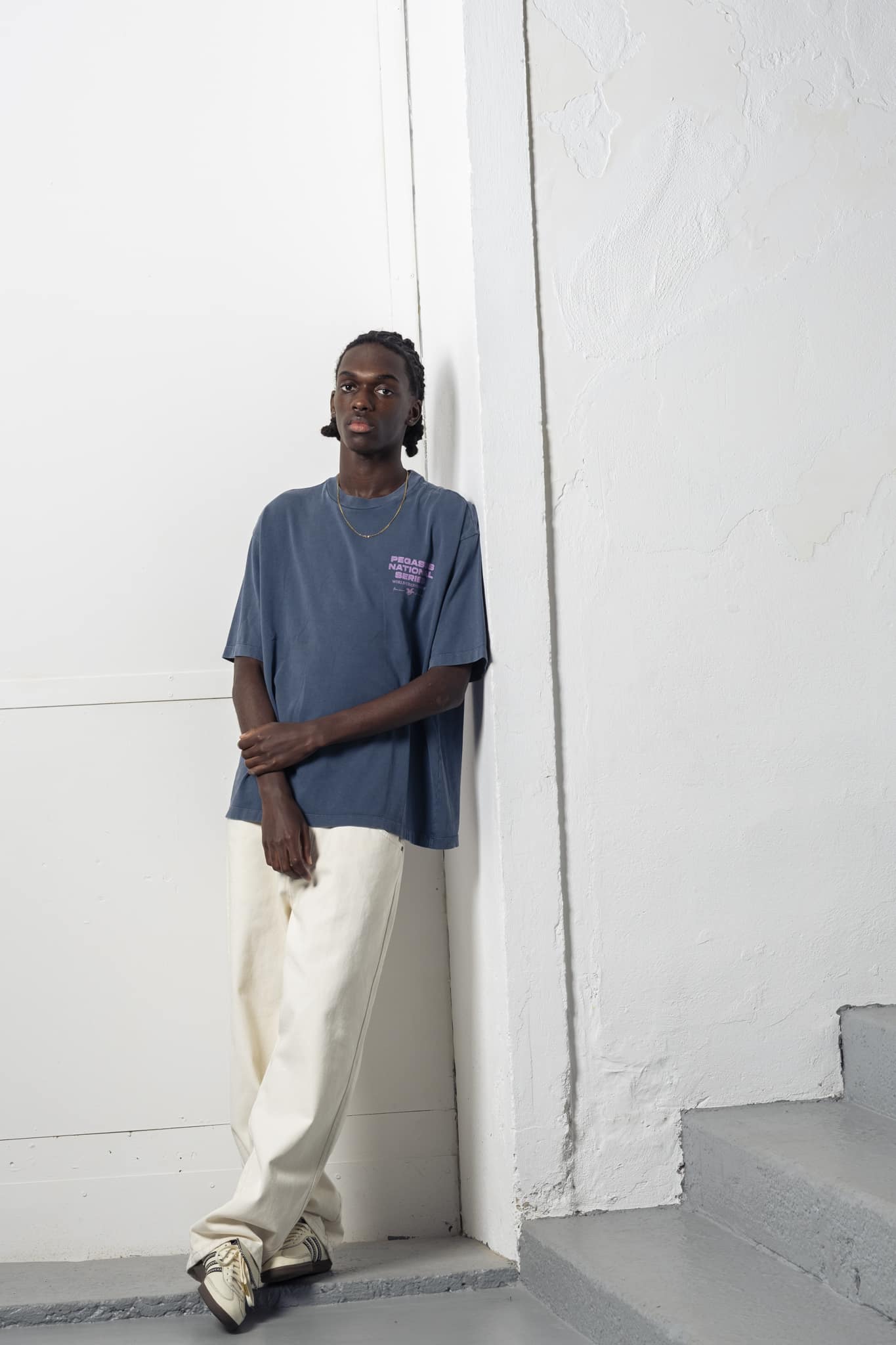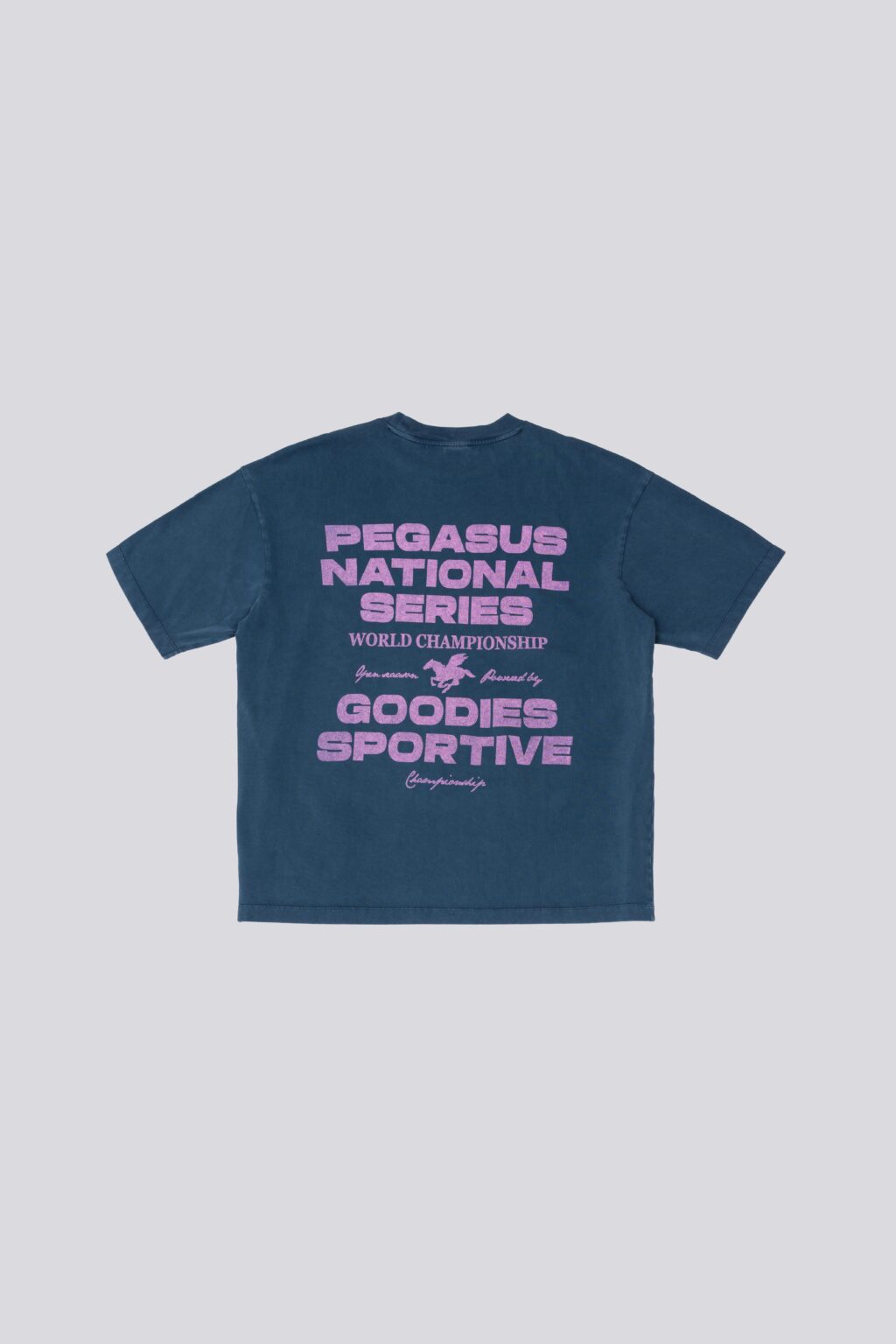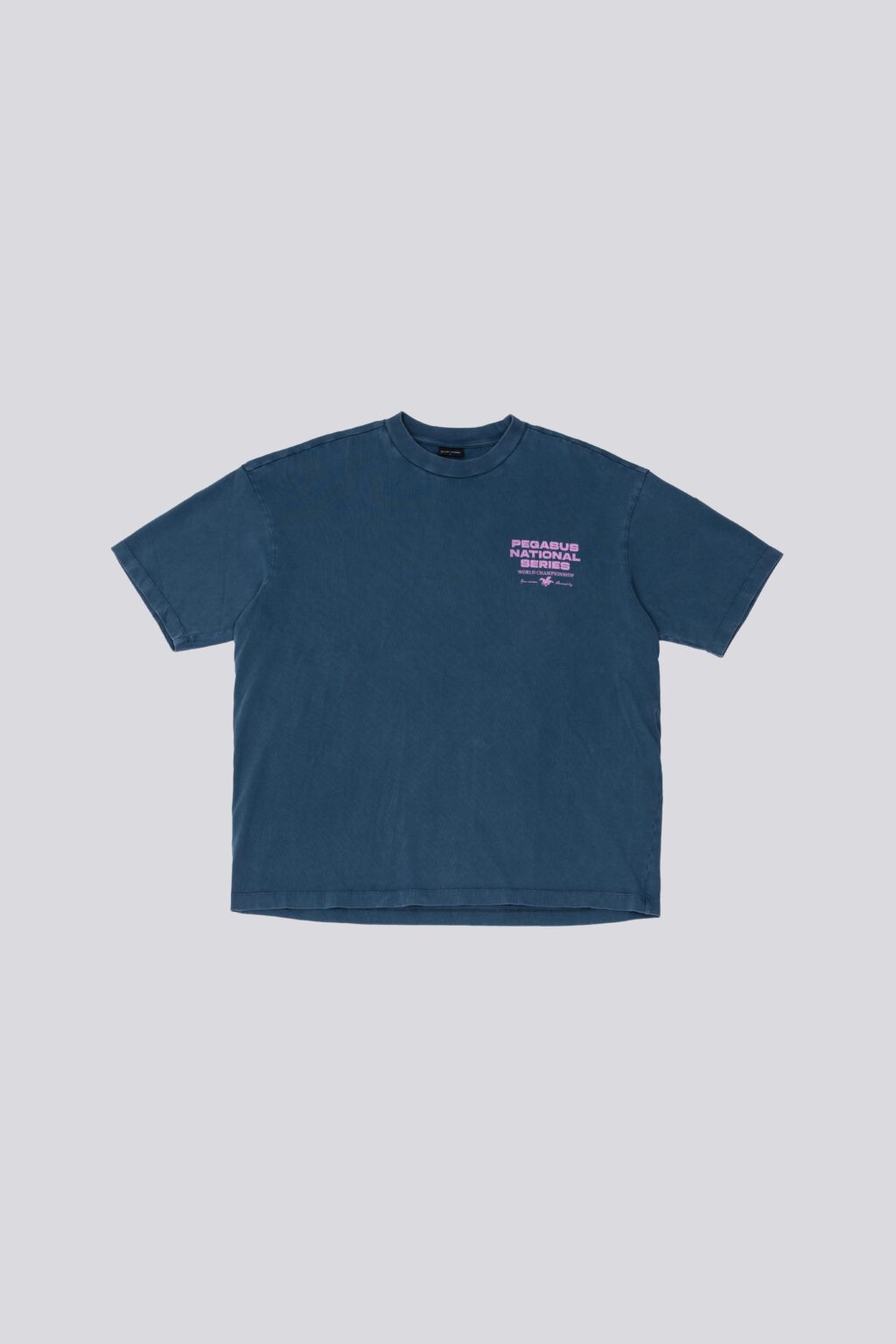 Blauw katoenen T-shirt met opdruk op linkerborst en middenrug.