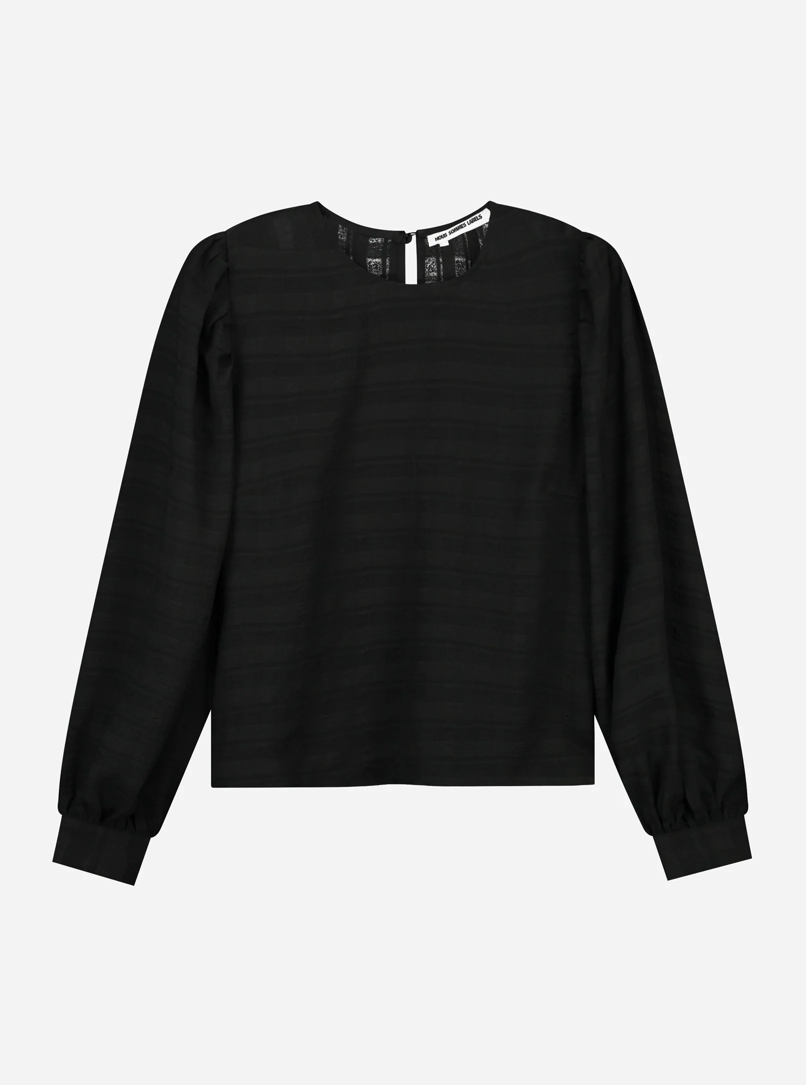 Lydie Top: zwarte top met lange mouwen. Gemaakt in een rechte pasvorm, met een ronde hals en pofmouwen. Ontwerpdetails zijn onder andere een achterkant met split en manchetten met knopen.