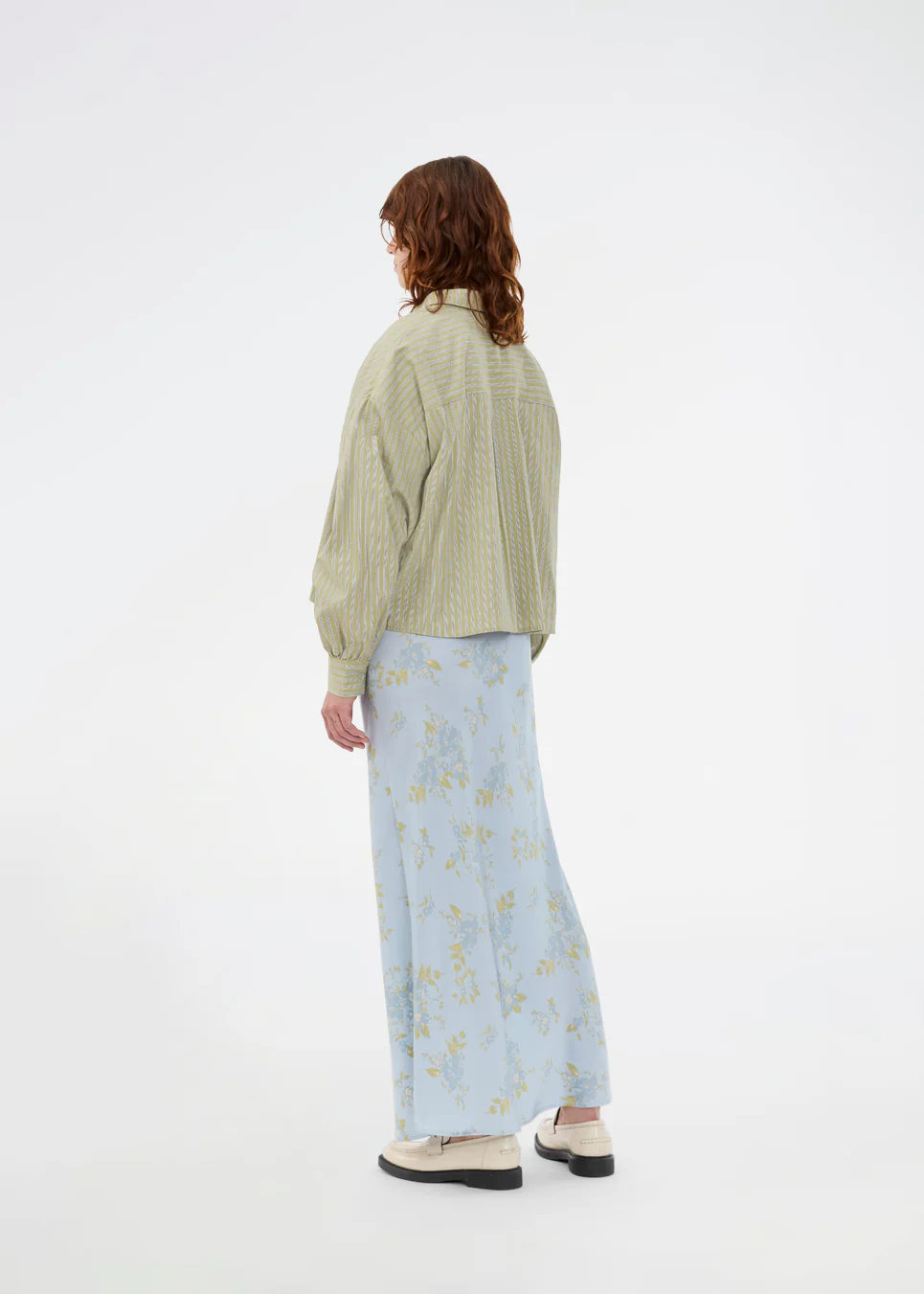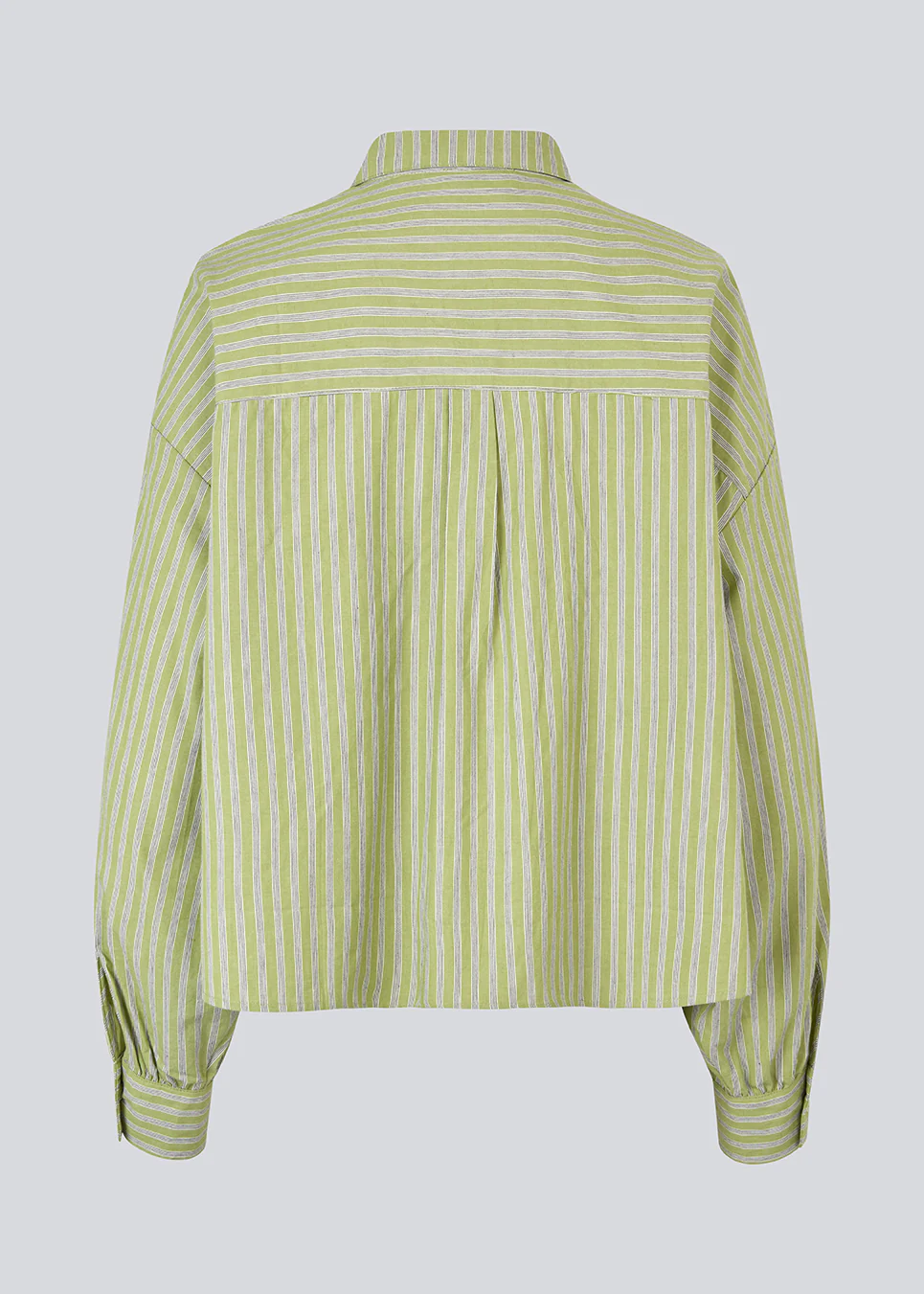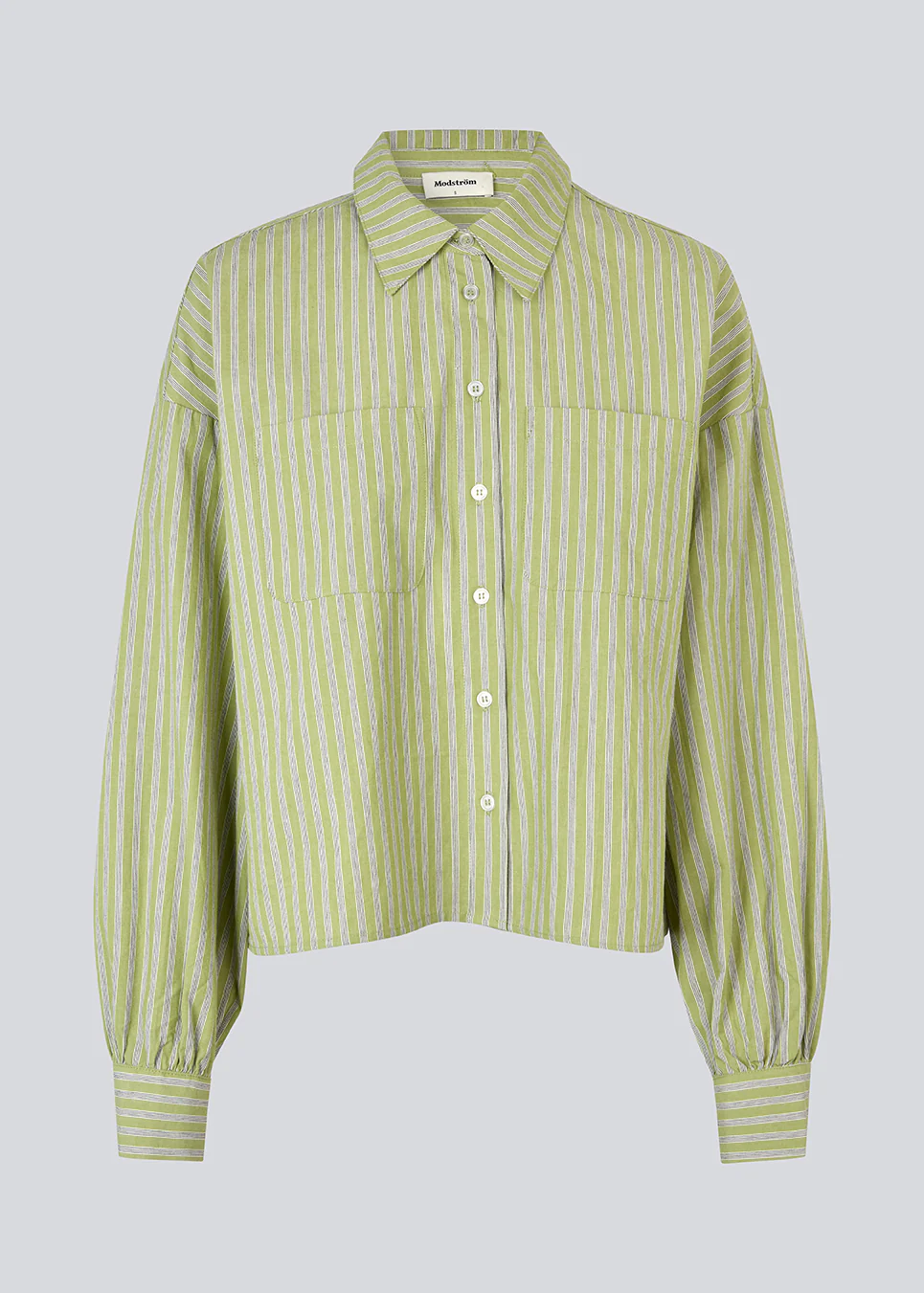 Gestreept overhemd in groen met ballonmouwen en vrouwelijke details. Het UmekoMD-overhemd heeft borstzakken, een klassieke kraag en een knoopsluiting – een moderne interpretatie van het tijdloze overhemd.