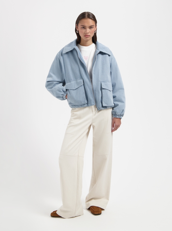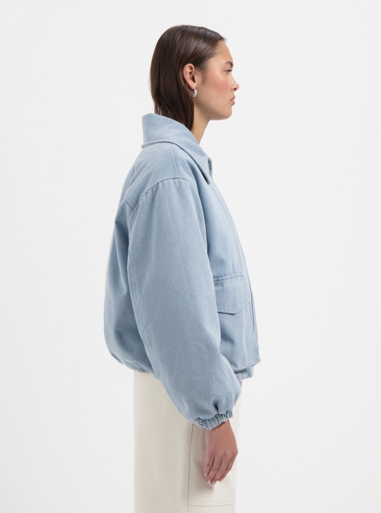 Zachte bomber jacker in de kleur Denim. valt Boxy en is lekker ruim.