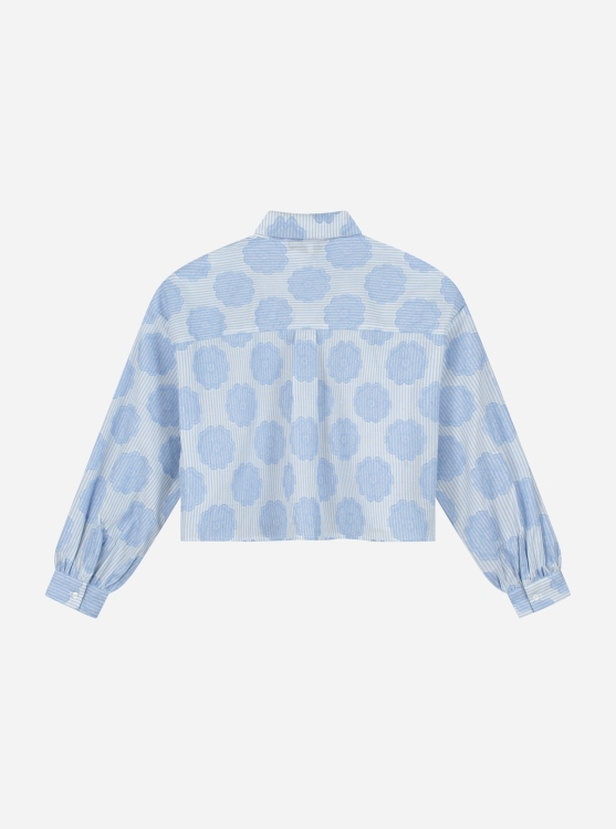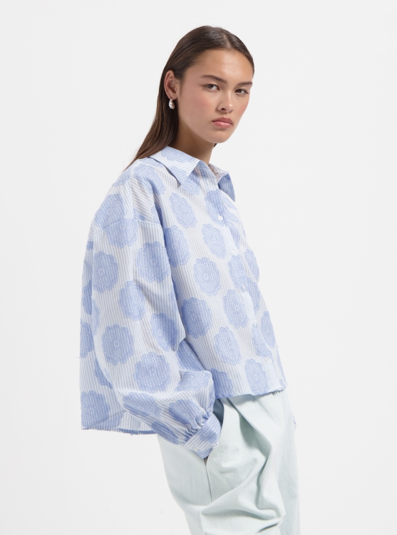 Een cropped blouse met lange mouwen, versierd met een frisse, zomerse print voor een lichte en speelse uitstraling.