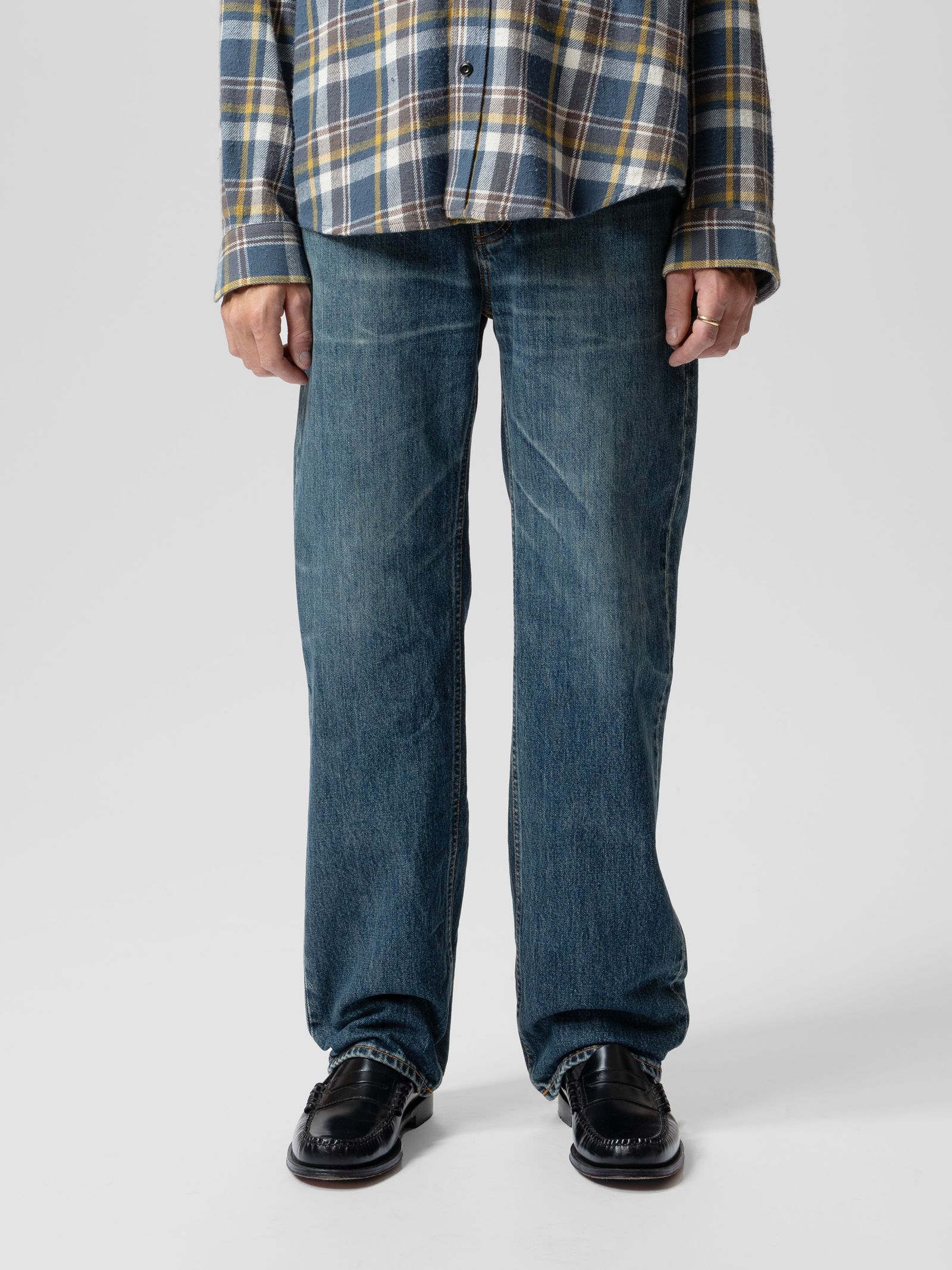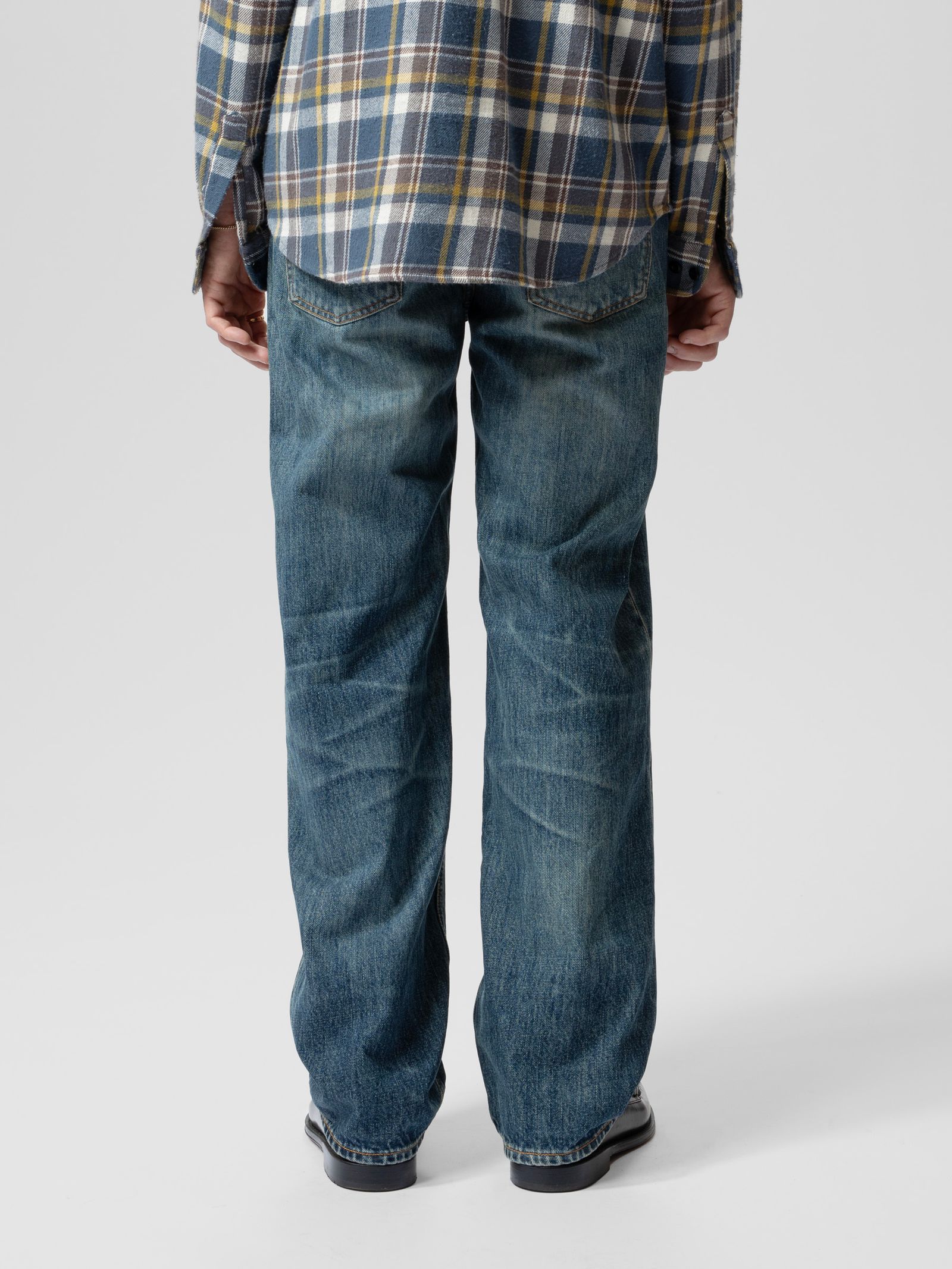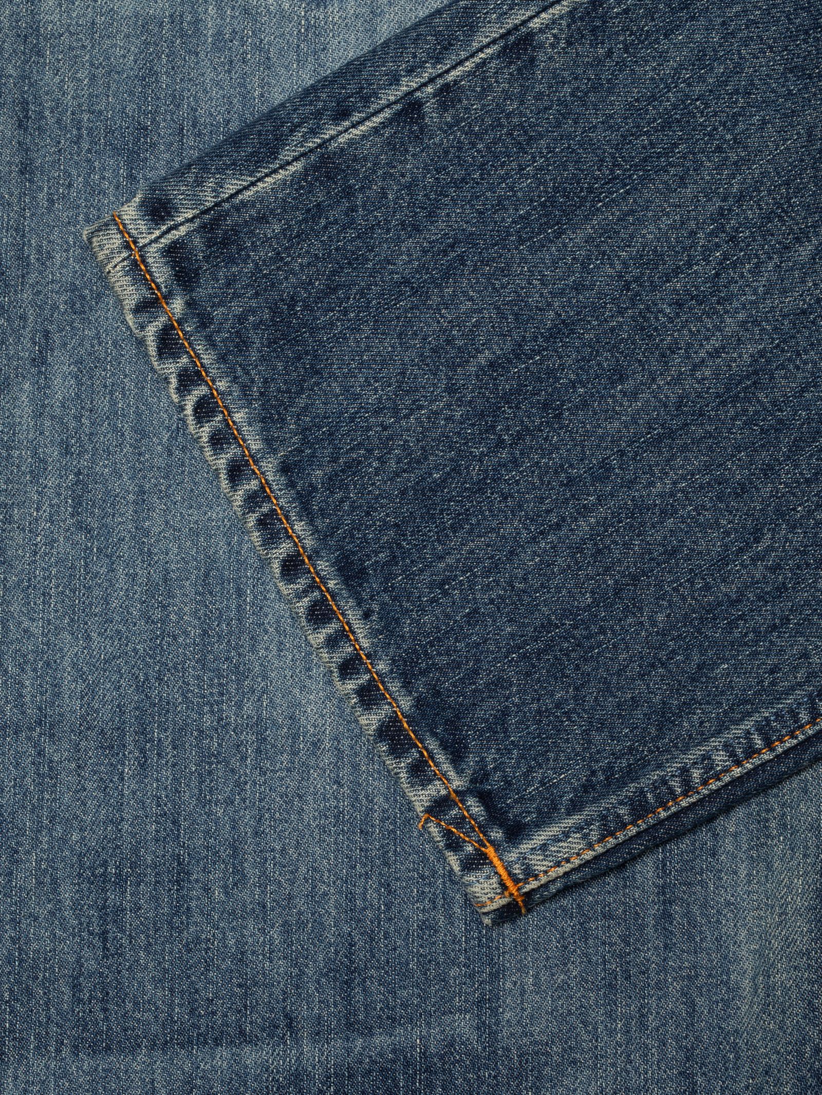 Gemaakt van uitzonderlijk denim, worden deze jeans gewassen tot een rijke, diepe indigokleur met een vleugje warmte. De stof heeft een robuuste textuur met uitgesproken verticale slubs en een marmerachtig patroon dat de donkere gebieden benadrukt. De nagebootste vervagingen en slijtageplekken zorgen voor een onmiskenbaar authentieke gedragen uitstraling.