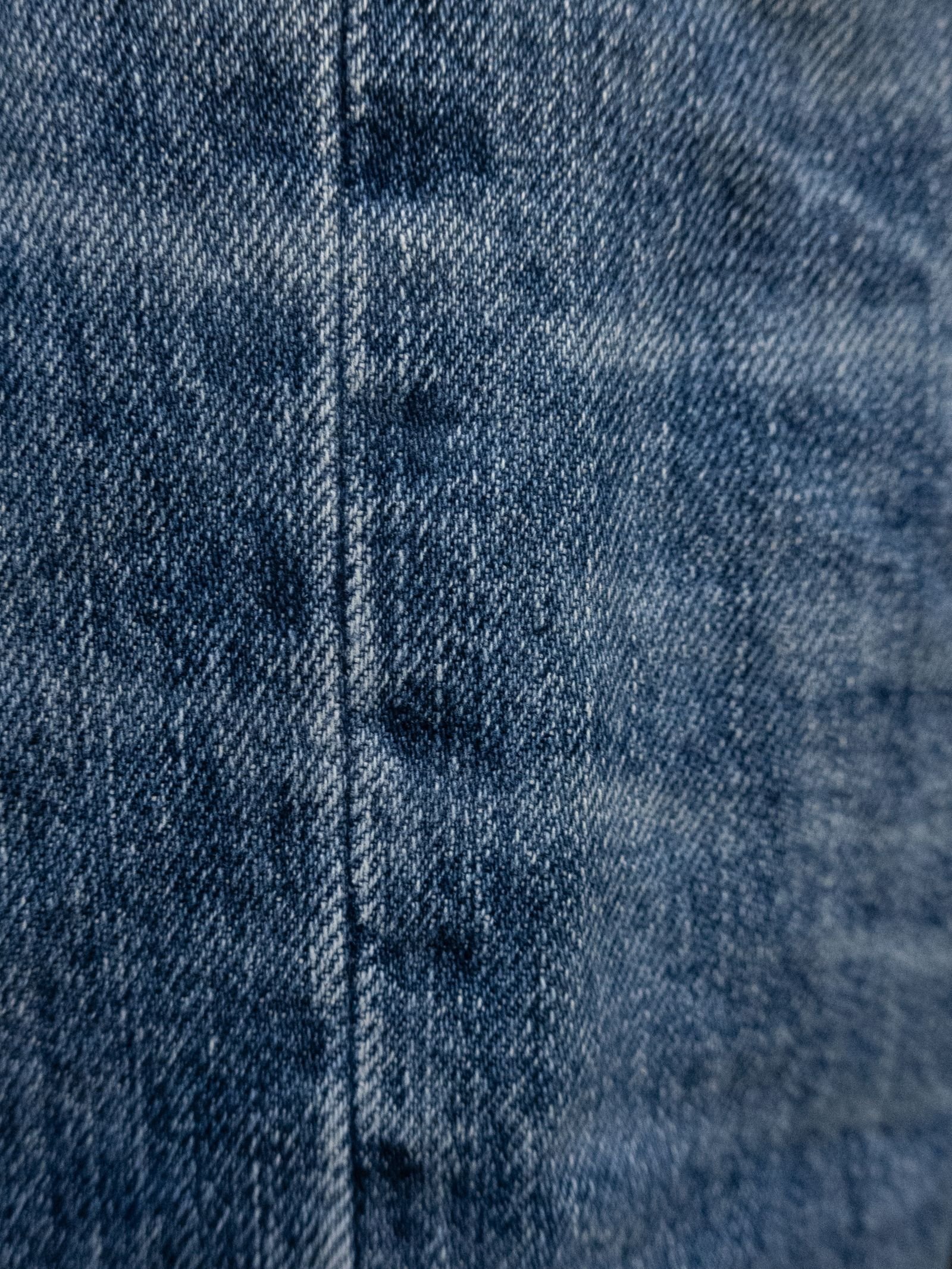Deze jeans, gemaakt van uitzonderlijk denim, zijn gewassen tot de perfecte heldere middenblauwe indigo tint. De stof heeft een robuuste textuur met uitgesproken verticale slubs en een marmerachtig patroon dat de donkere gedeeltes accentueert. De nagemaakte vervagingen en slijtageplekken zorgen voor een onmiskenbaar authentieke, ingedragen esthetiek.