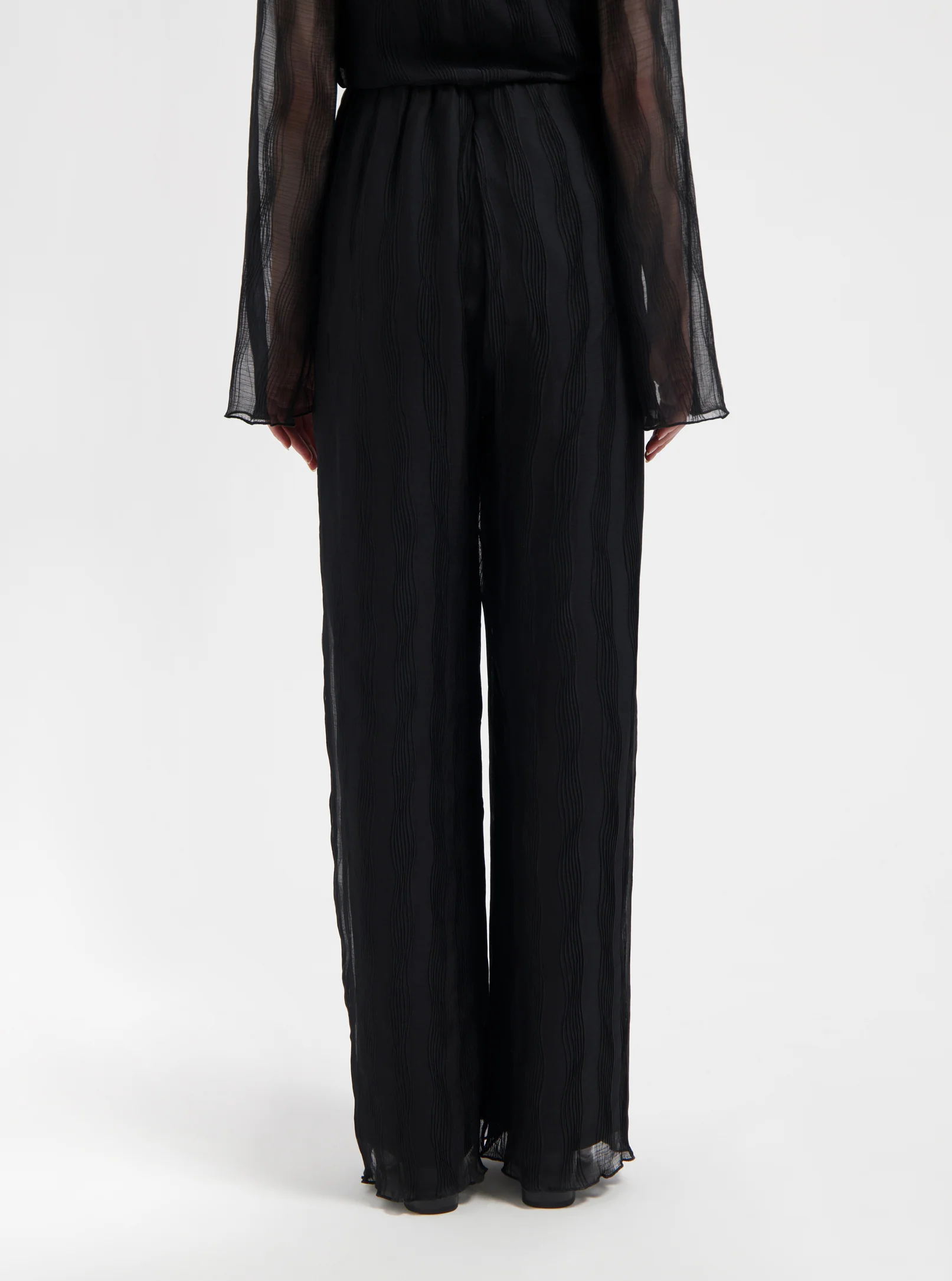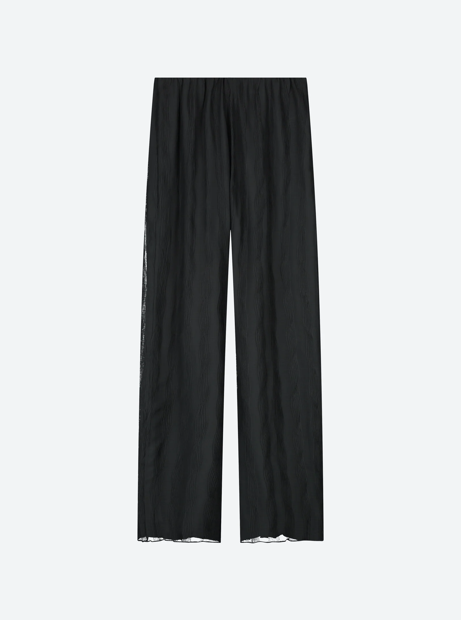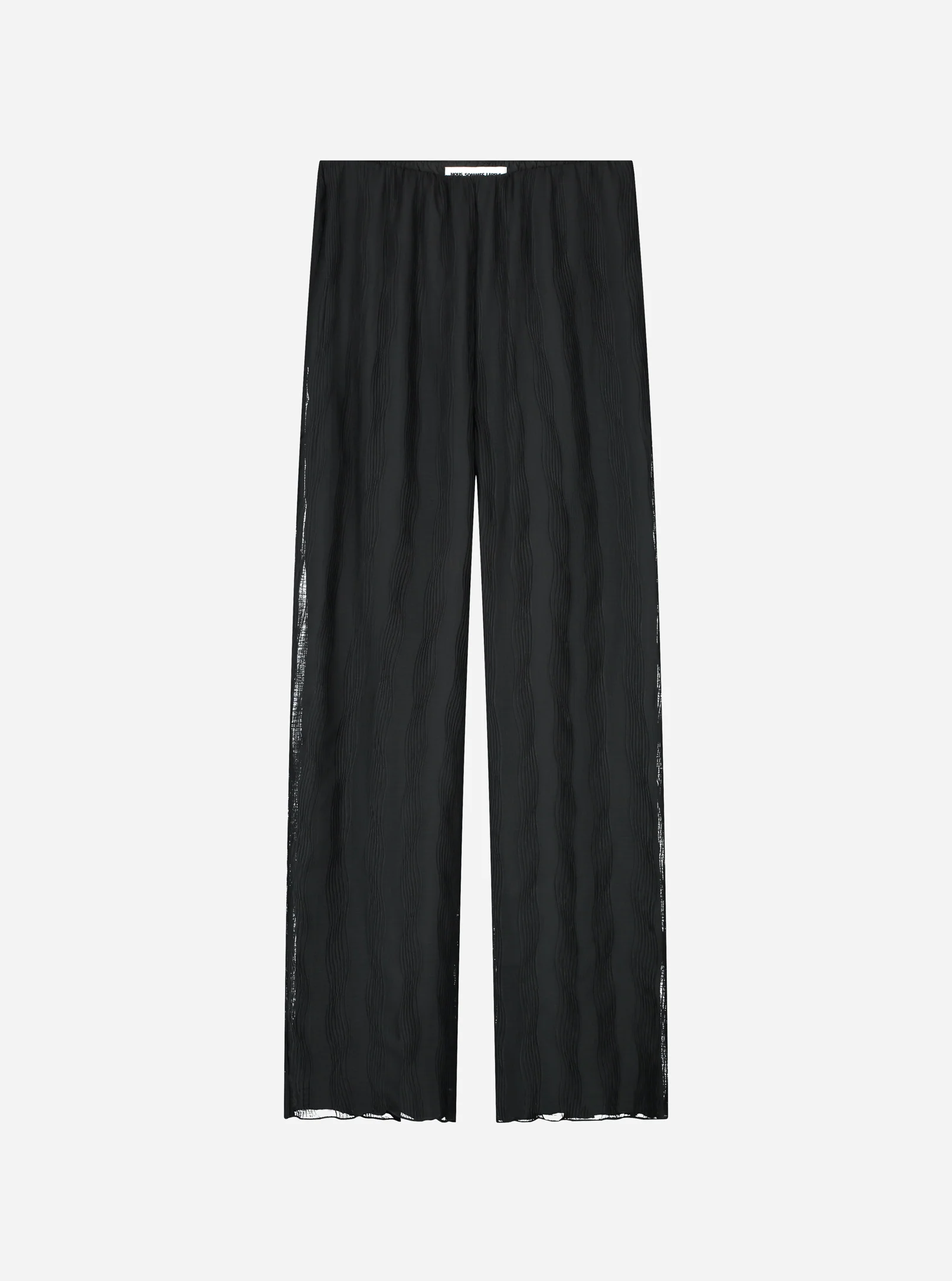 Zwarte plissébroek met een gestructureerd meshgevoel. De relaxte, wijd uitlopende pasvorm combineert comfort met een verfijnde uitstraling.