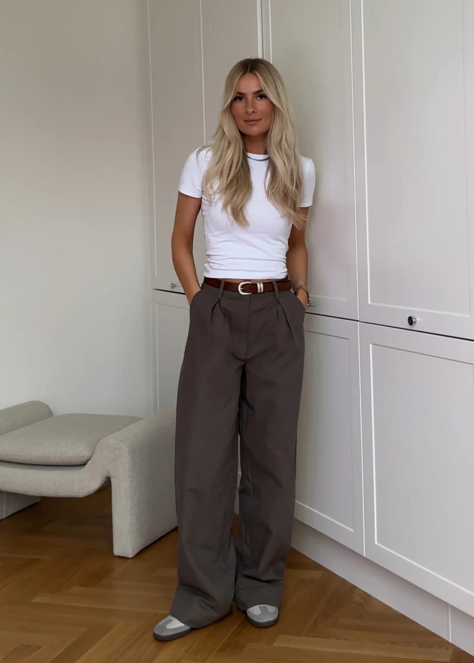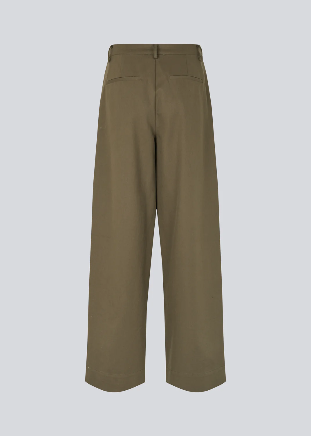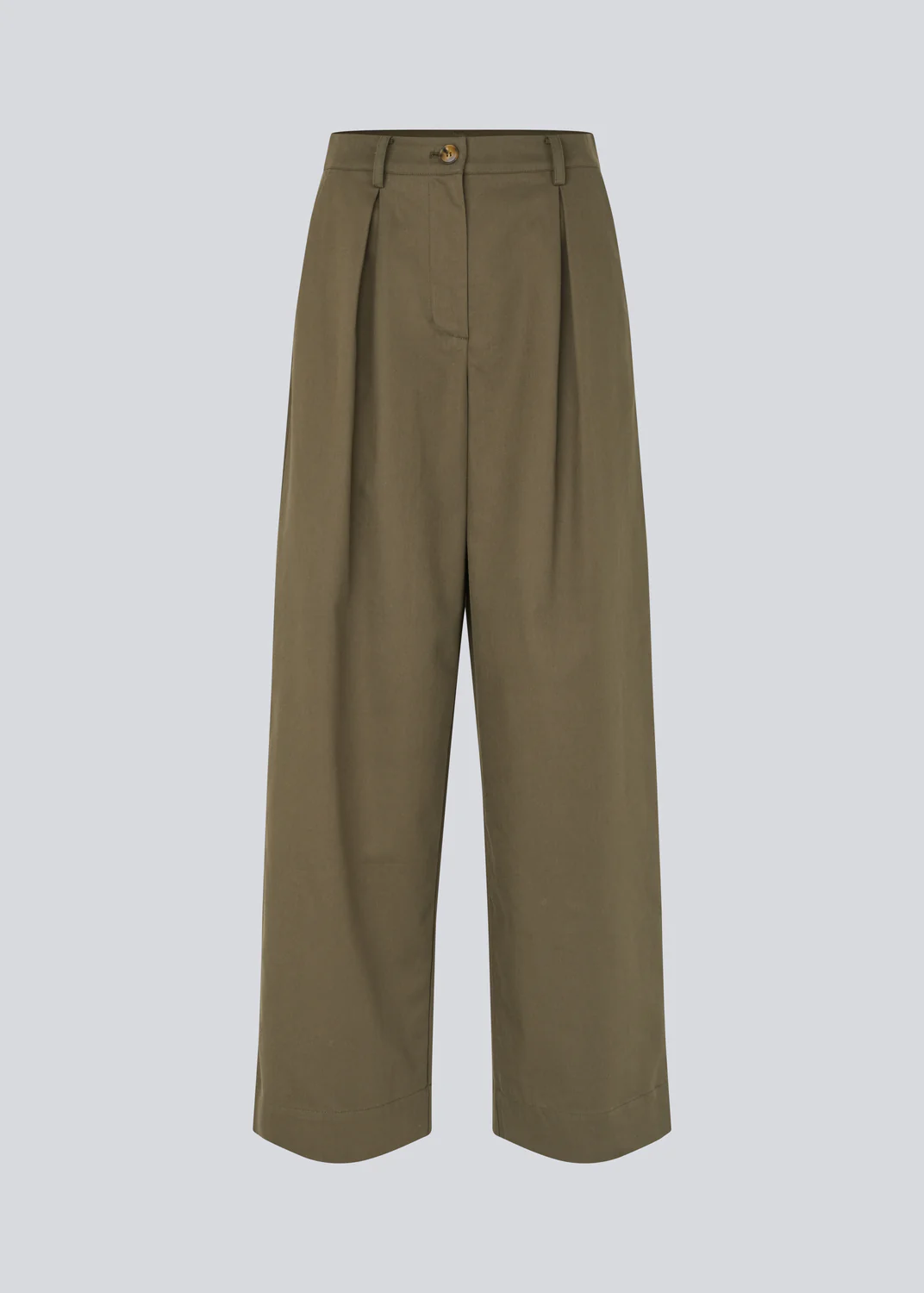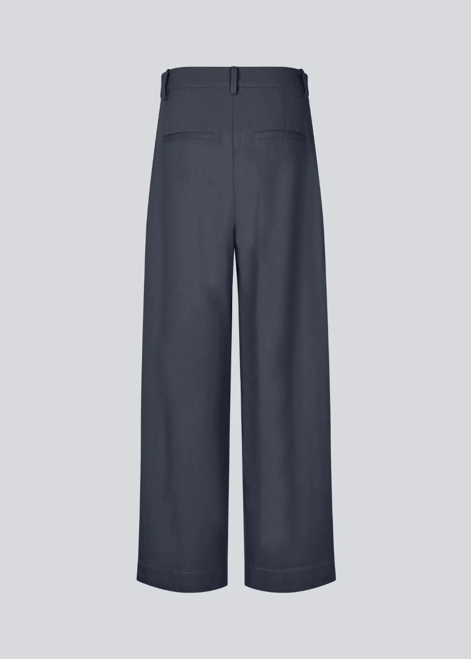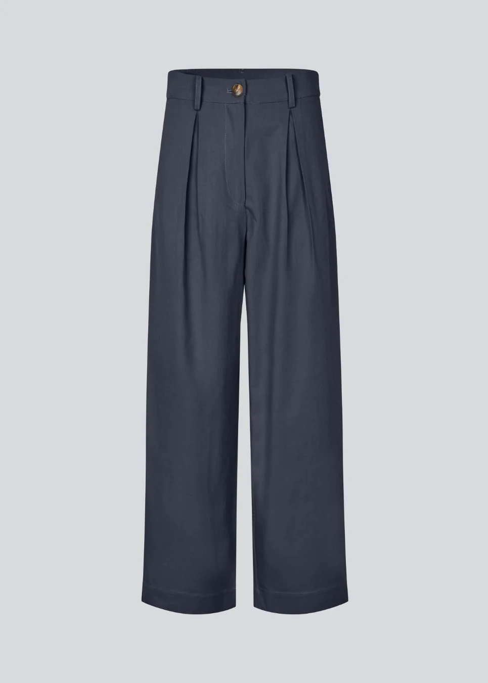 Broek van twill met wijde pijpen en plooien aan de bovenkant in donkerblauw. De ToreMD-broek heeft een middelhoge taille, een rits, steekzakken en een paspelzak aan de achterkant.