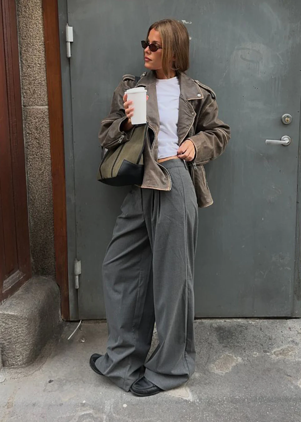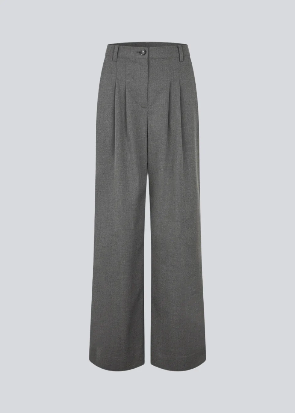 Grijze pantalon met plooien en wijde pijpen. Tuesdaymd-broek heeft een middenhoge taille, ritssluiting, zijzakken en paspelzakken aan de achterkant.